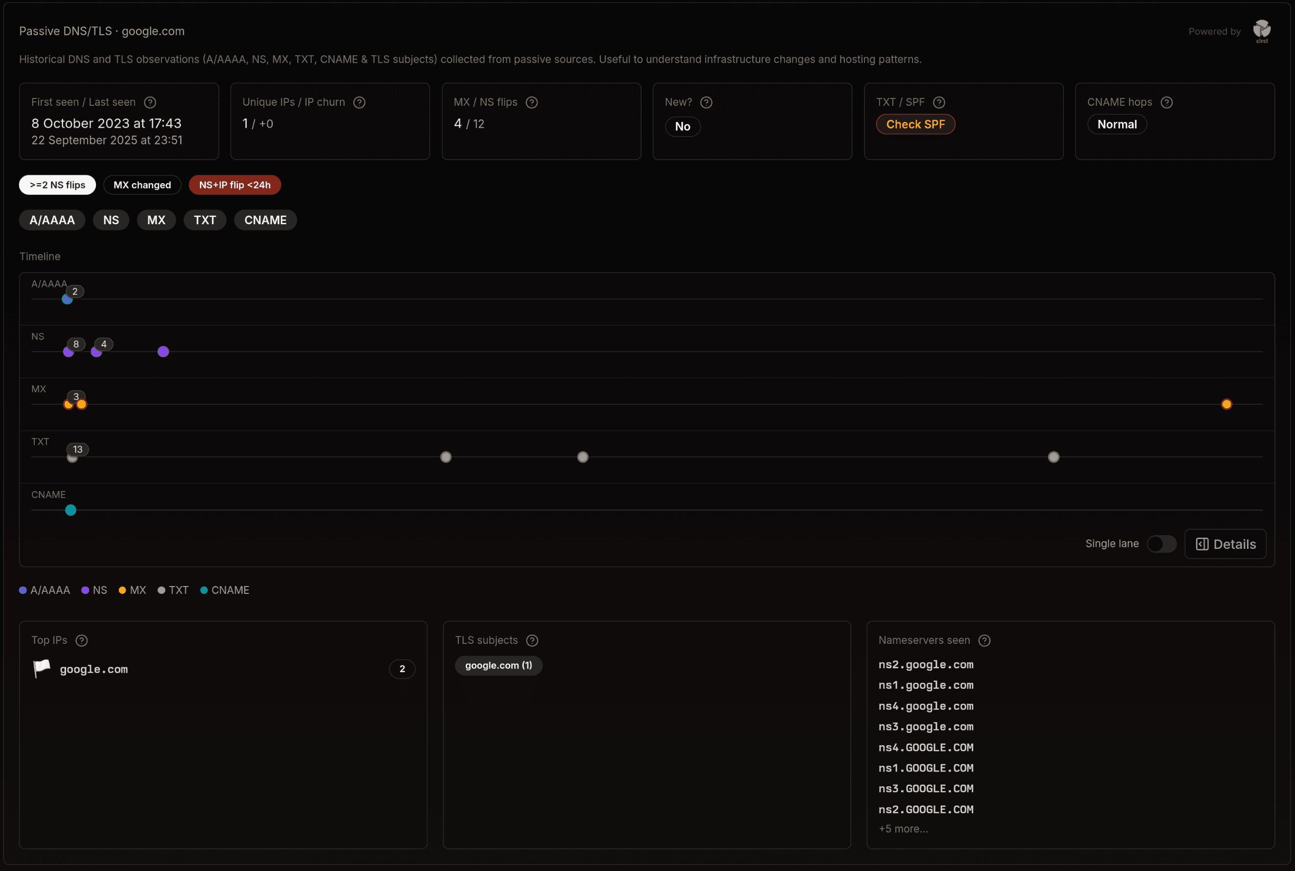 - Passive DNS timeline with A/AAAA, NS, MX, TXT, CNAME series